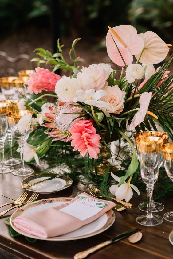 We are obsessed with this trend. Think bold pops of colour mixed with leafy tropical foliage such as Monstera leaves and Palms. Why not add a touch of gold for an added luxe feel.